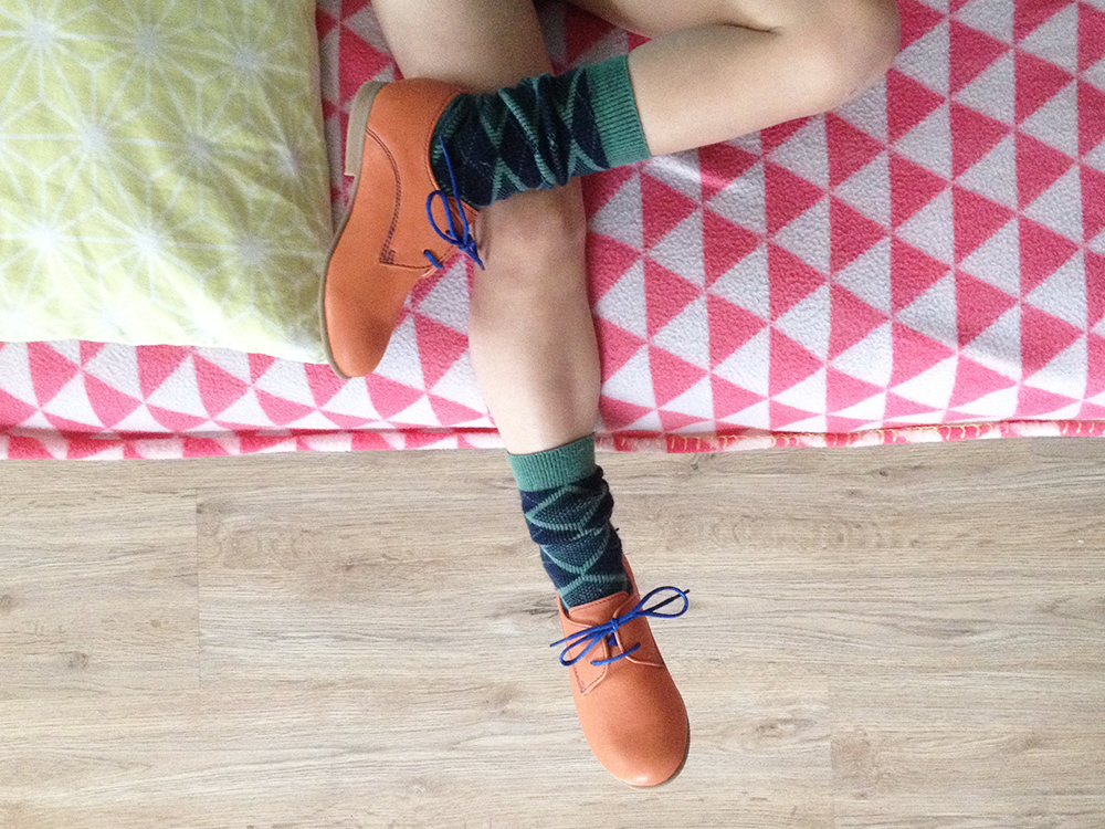 ...et le loulou a passé la journée avec ses nouvelles chaussures Clotaire aux pieds, dont je suis raide dingue. Apparemment lui aussi en est fou puisqu'il ne voulait plus les ôter. J'ai commencé à l'habiller et, ni une ni deux, Monsieur voulait ses derbies, donc hop, slip-chaussures, où comment avoir la classe en toutes circonstances. Puis, on a eu droit à un numéro de claquettes endiablé, des essais de toutes sortes de noeuds - dont l'invention du noeud escargot comme il l'a nommé, une sorte de boule de lacets, très sympathique à démêler...